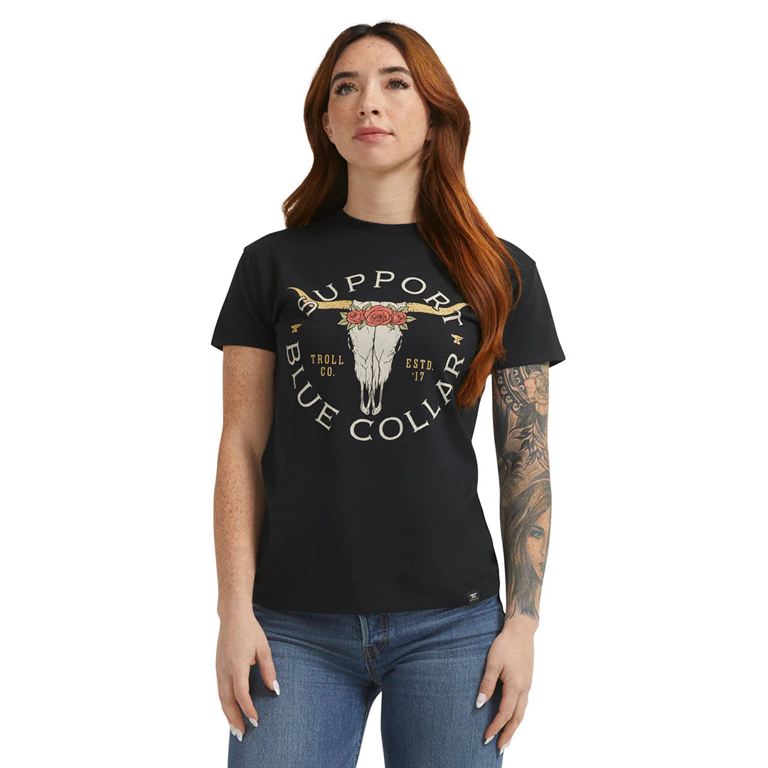SBC Longhorn T-Shirt — Wearing the Support Blue Collar badge loud and proud, this design is for those who stand behind this country's hardworking backbone. The longhorn represents strength, resilience, and the no-BS attitude that keeps the trades moving forward.