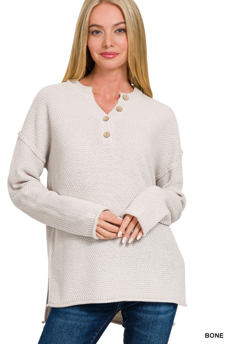 4 BUTTONS HENLEY NECKLINE BASIC SWEATER - MIDWEIGHT - GOOD QUILITY BASIC SWEATER