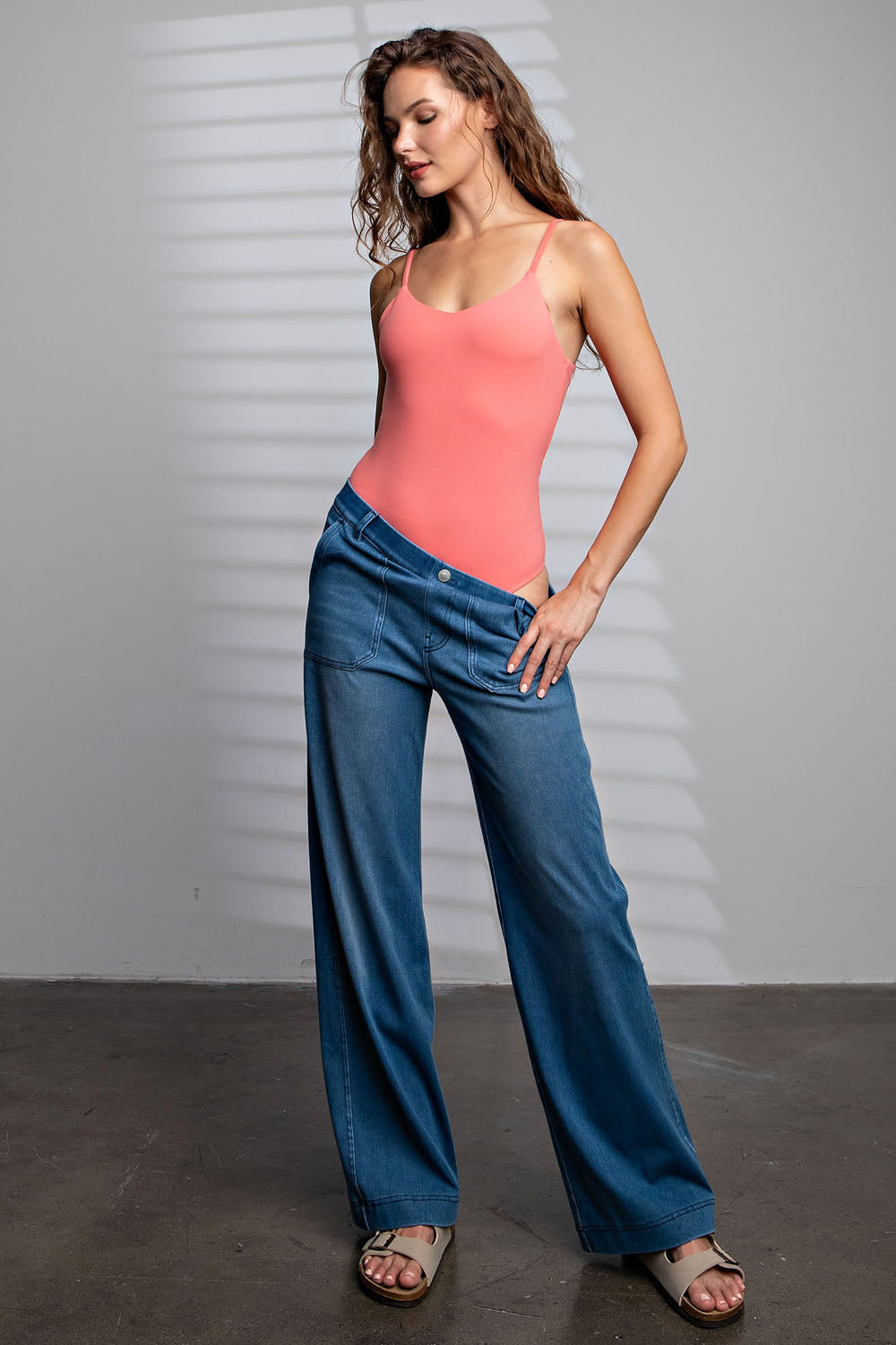 Experience ultimate comfort and versatility with this luxurious bodysuit. Crafted from a buttery-soft fabric, it feels like a second skin. The adjustable spaghetti straps provide a customizable fit, and the thong lining ensures a seamless look under any outfit. Elevate your wardrobe with this essential piece that effortlessly combines comfort and style.