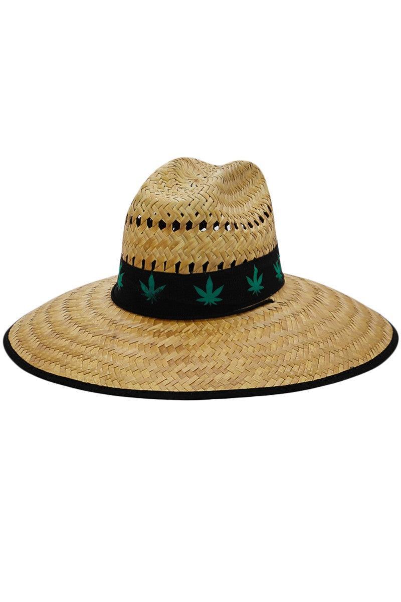 Marijuana MJ Cannabis Leaf Print Band Cattleman Crown Wide Dome Brim Natural Straw Outdoor Lifeguard Hat -Open Weave Vented Upper Crown (Weave varies on every batch) -Matte Black Grosgrain Fabric Trim Edge -Brim Size: 5.25" -Inner elastic band and adjustable chin strings -Head Size: OS (About 55cm-58cm AKA M/L)