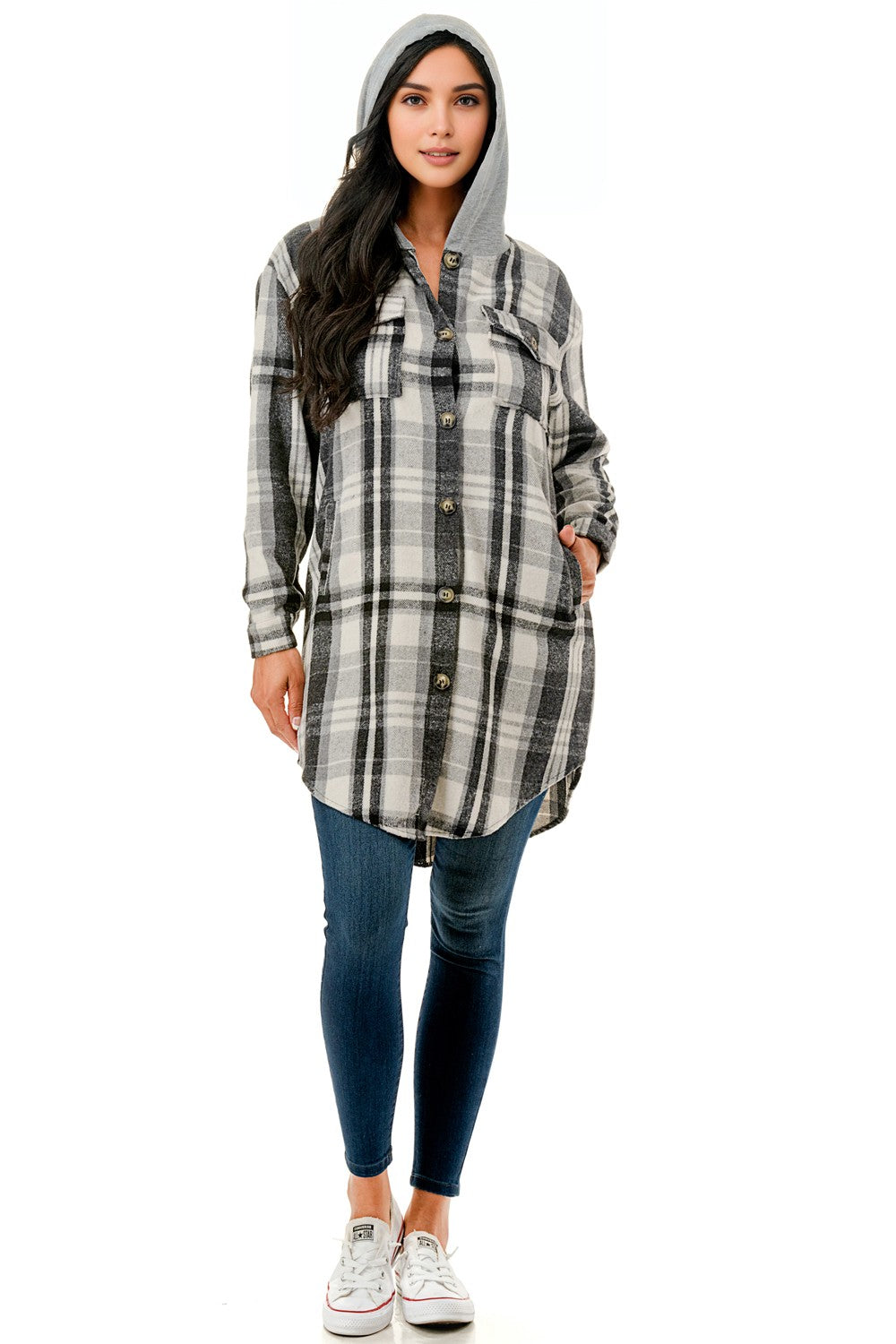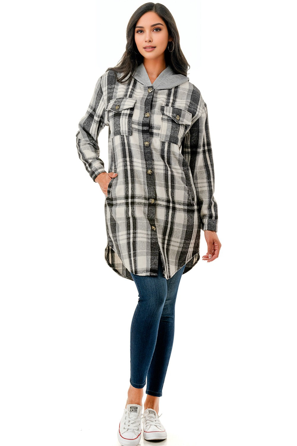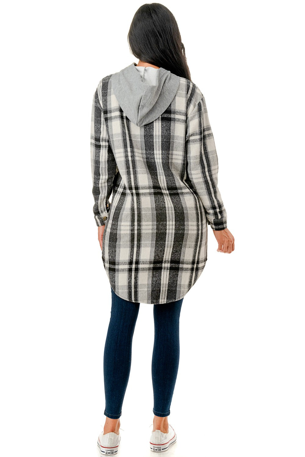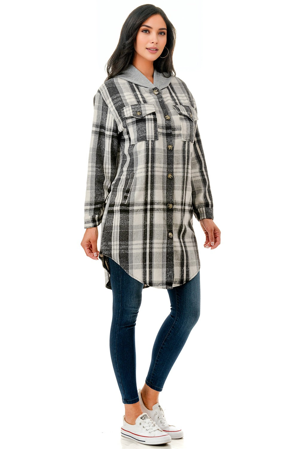 Malibu Plaid over size long flannel shacket with hood jk0388 black