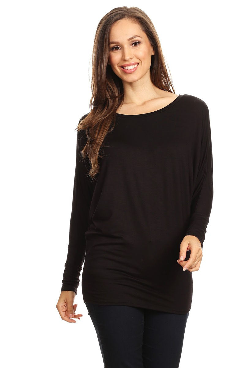 Solid jersey knit dolman top with boat neckline and long sleeves and tapered bottom *Approx: Length: 27in, Bust: 37in,Sleeve: 18in, Shoulder: 18in *Size based on SMALL