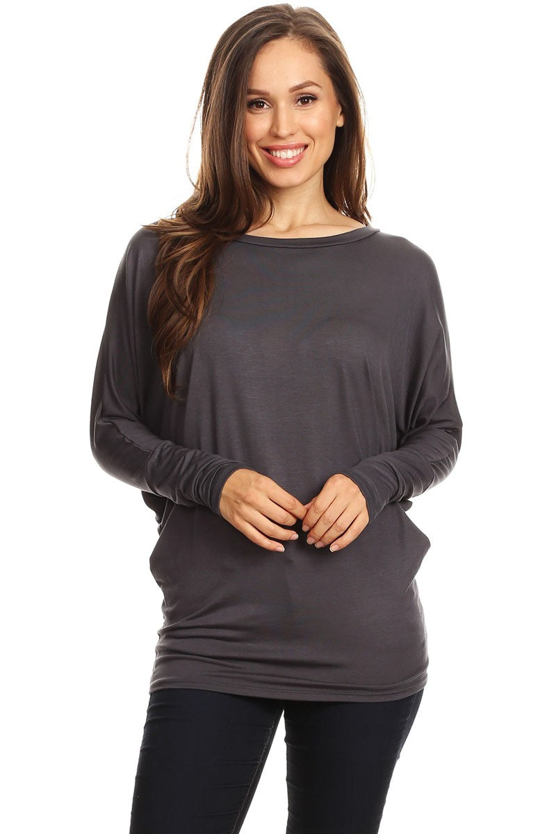 Solid jersey knit dolman top with boat neckline and long sleeves and tapered bottom *Approx: Length: 27in, Bust: 37in,Sleeve: 18in, Shoulder: 18in *Size based on SMALL