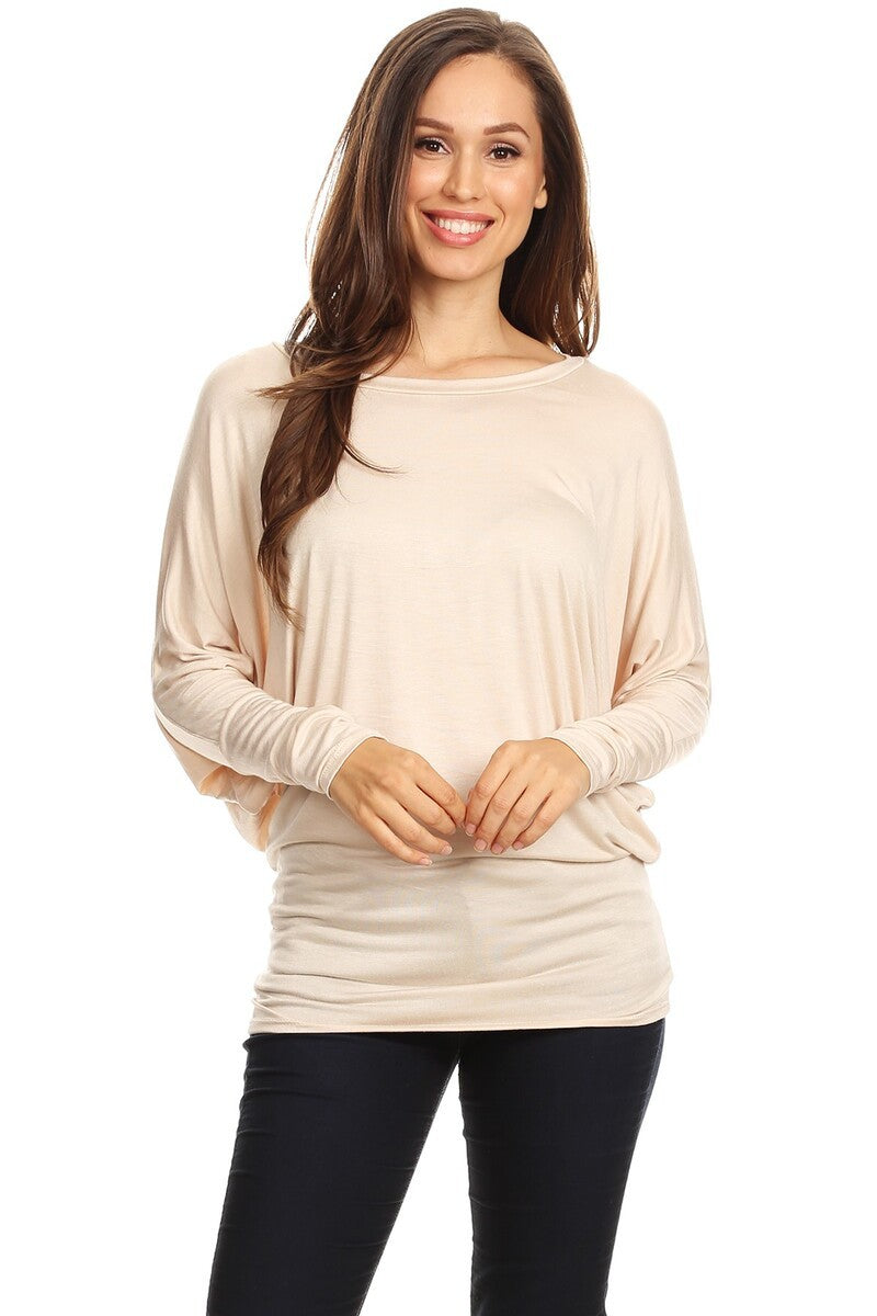 Solid jersey knit dolman top with boat neckline and long sleeves and tapered bottom *Approx: Length: 27in, Bust: 37in,Sleeve: 18in, Shoulder: 18in *Size based on SMALL