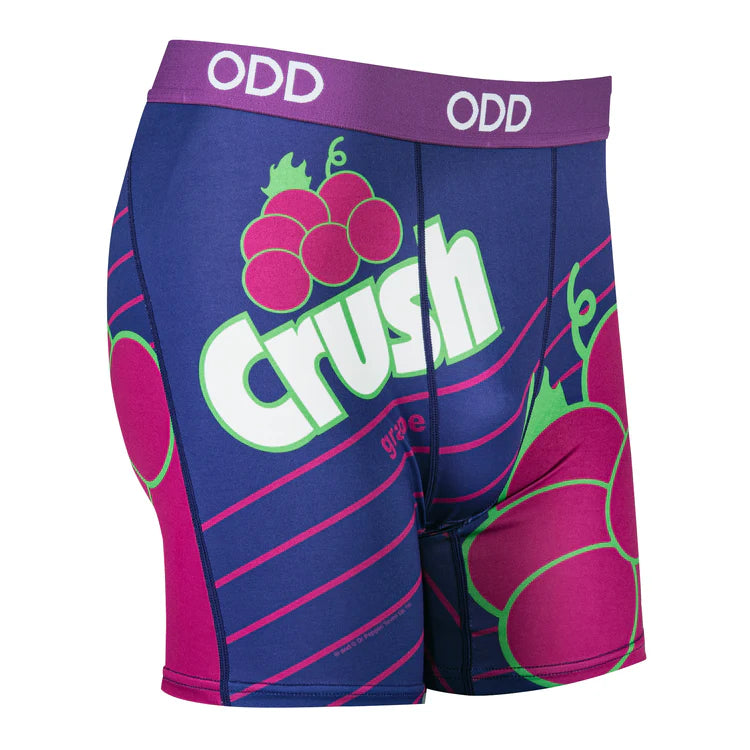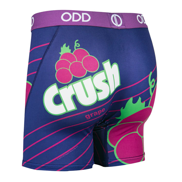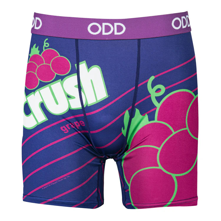 Crush the competition in these purple Grape Crush boxer briefs for men. These purple briefs feature the Crush logo with purple grapes all over with violet stripes. Each pair of briefs is designed with a high-quality fabric blend that keeps you dry while preventing orders with a flexible waistband. Complete with a 3D no-fly pouch and all over stretch that provides support and freedom and movement.