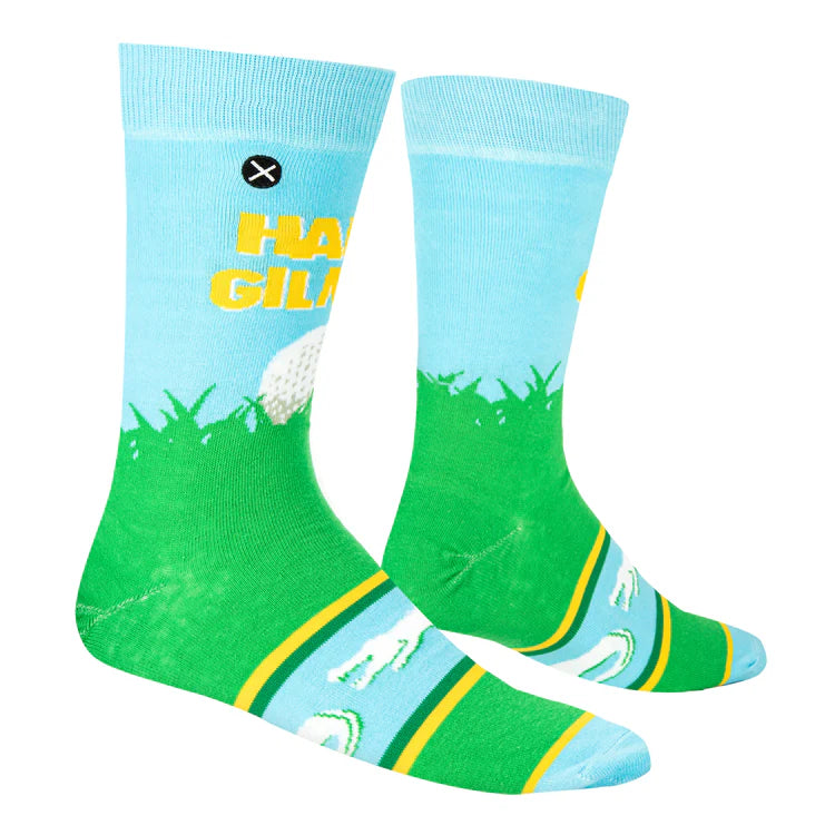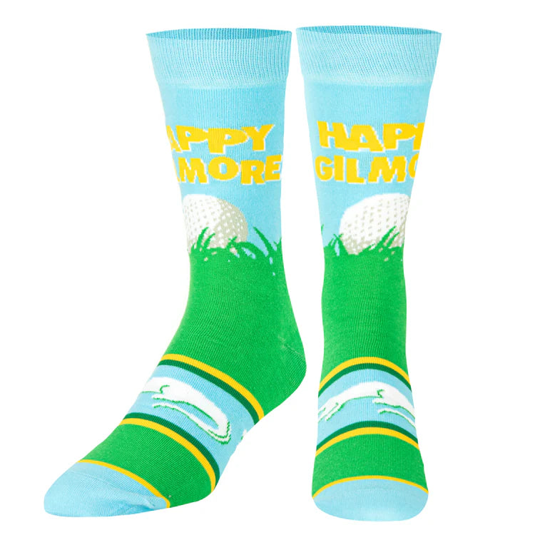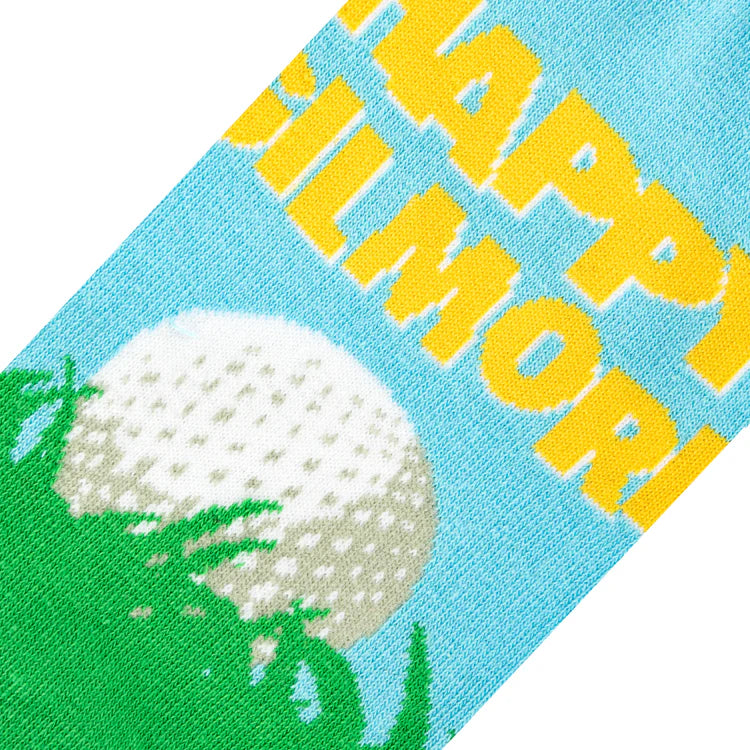 .Why don't you just go home and buy these Happy in the Rough crew socks from the classic Adam Sandler film, Happy Gilmore. These crew socks feature a graphic knitted image of a golf ball on a patch of grass with the Happy Gilmore movie title in yellow. The poly-cotton blend ensures a vibrant image with a padded toe and heel for extra cushioning. Each pair of socks is complete with a y-gore fitted heel and extended cuff to prevent sliding.