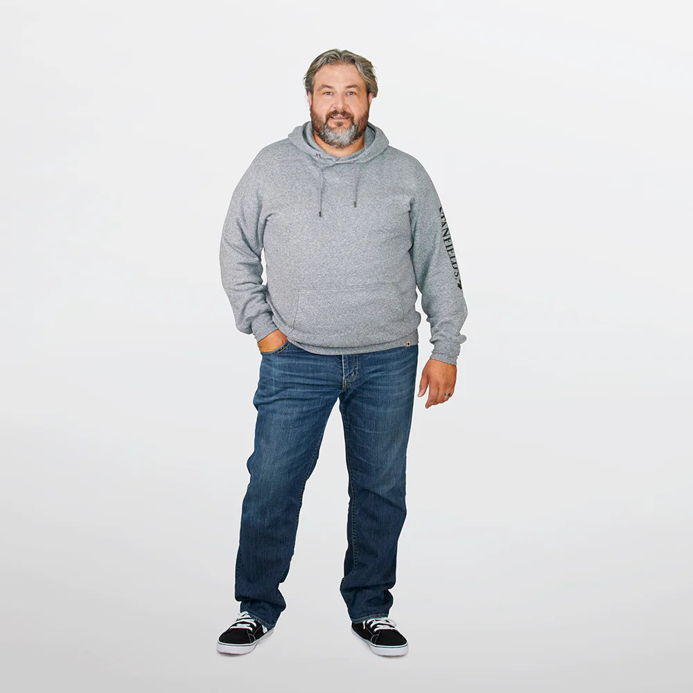 Our classic salt & pepper hoody with our favourite brand screen printed on the sleeve.