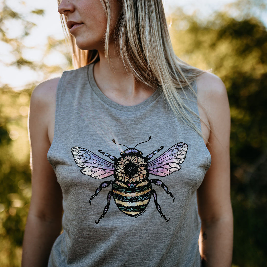 West Coast Karma Colourful Sunflower Bee Muscle Tank in Grey