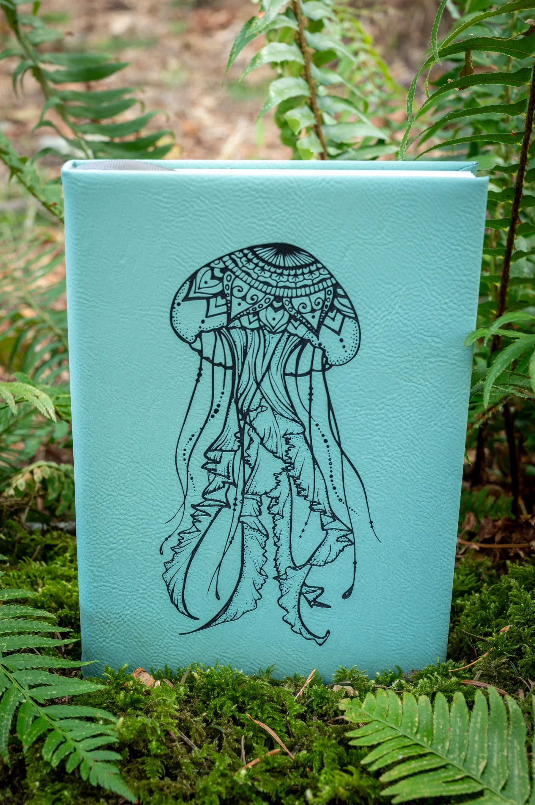 This intricate Jellyfish journal is perfect for writers, travelers or those who love to journal. Locally engraved with a laser which won't fade or scratch away. It has the look and feel of genuine leather but this synthetic material resists water spots, cleans easily and is durable enough for daily use. Lined pages and a satin ribbon bookmark.
