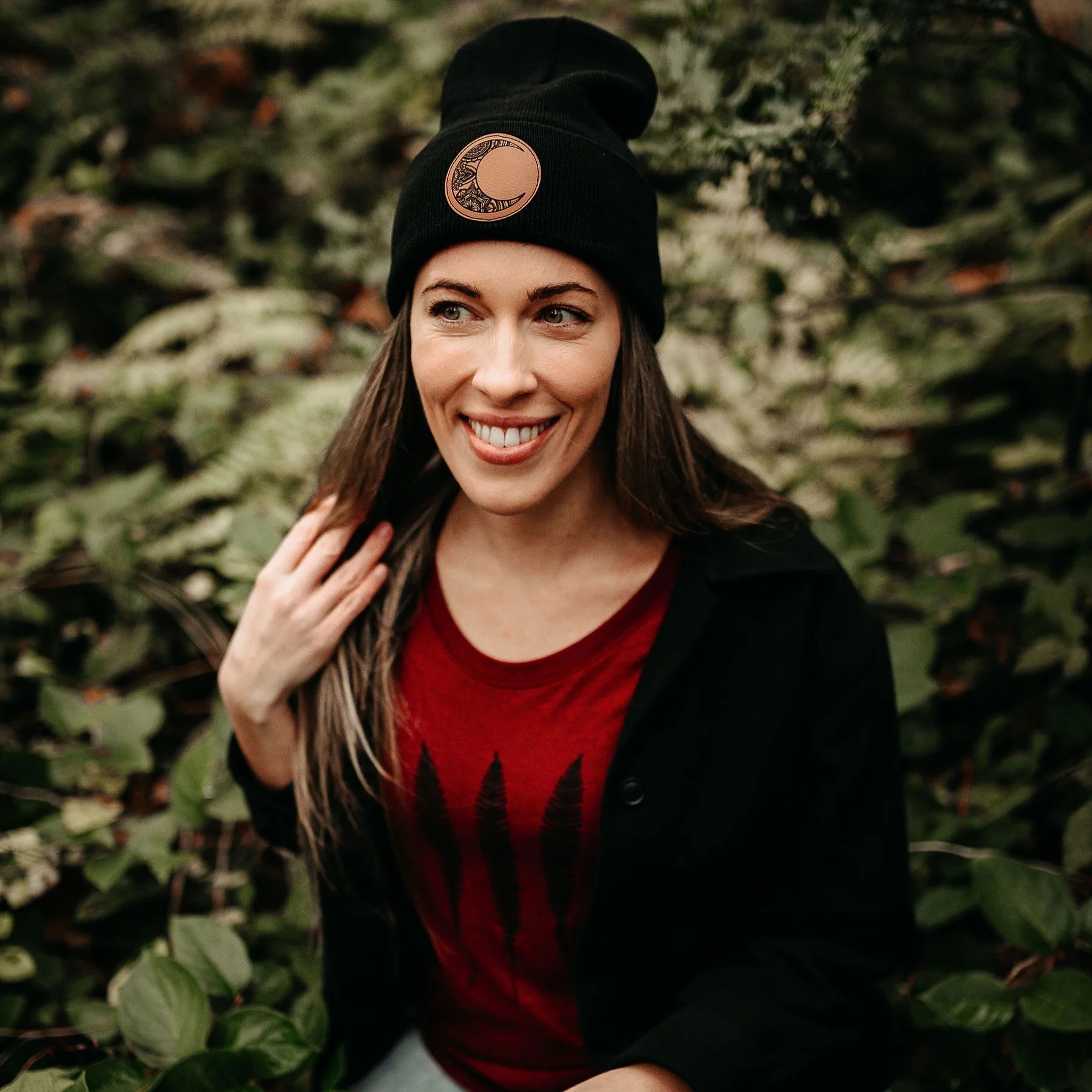 The Mandala Moon Toque is perfect for cold winters, outdoor activities or walking around town. Locally engraved vegan leather patches.