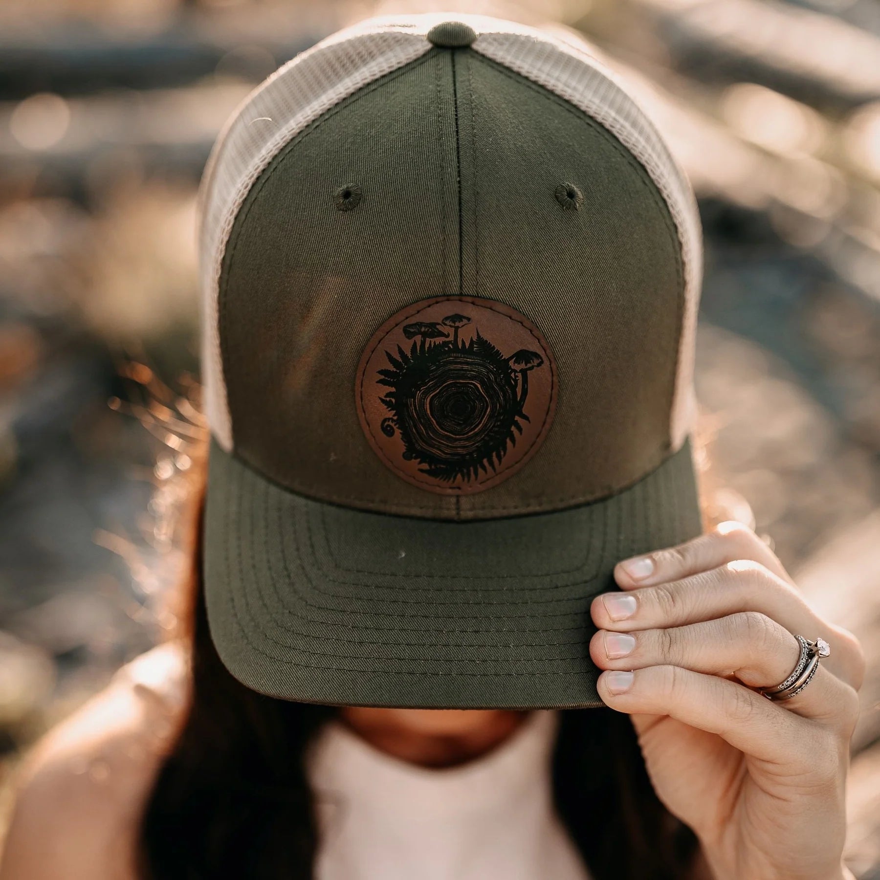 Our adjustable Mushroom Tree Ring mesh back trucker cap satisfies even the most selective hat crowd. Integrating style with personalized fit with an adjustable back. Our Flexfit Mesh cap is about to become your favorite hat.