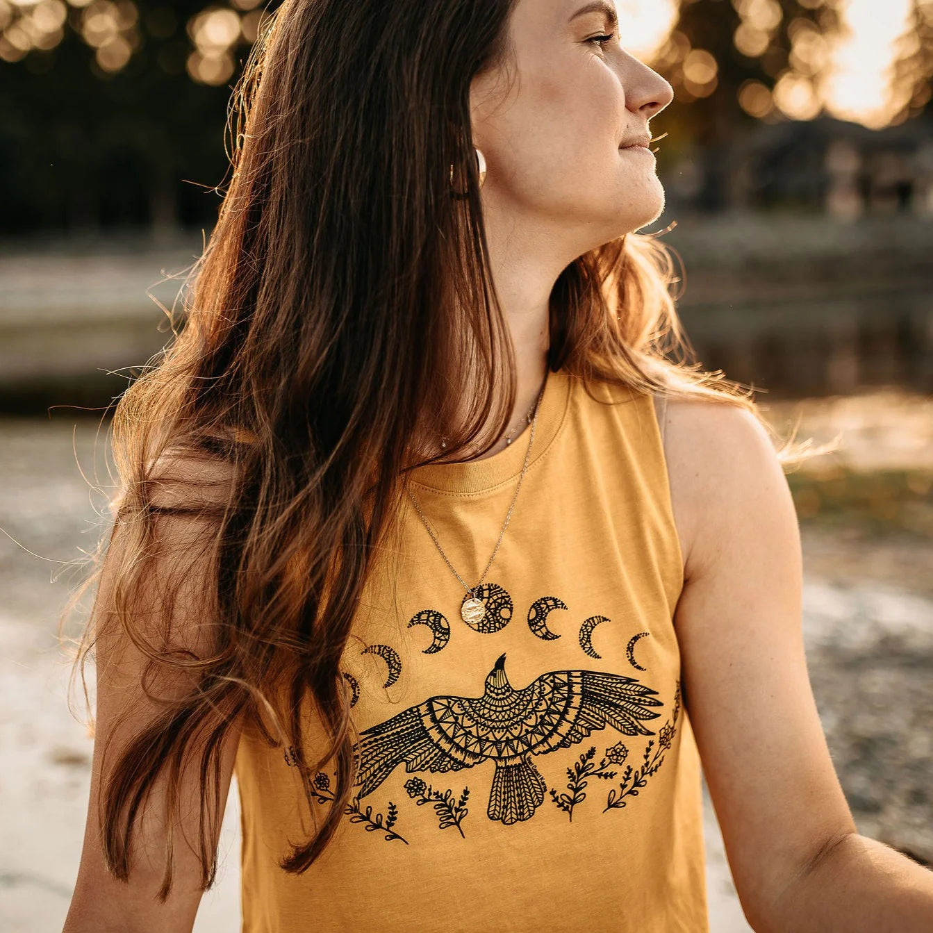 Detailed, hand drawn Raven Moon Phase design, locally silk screened with eco friendly ink.