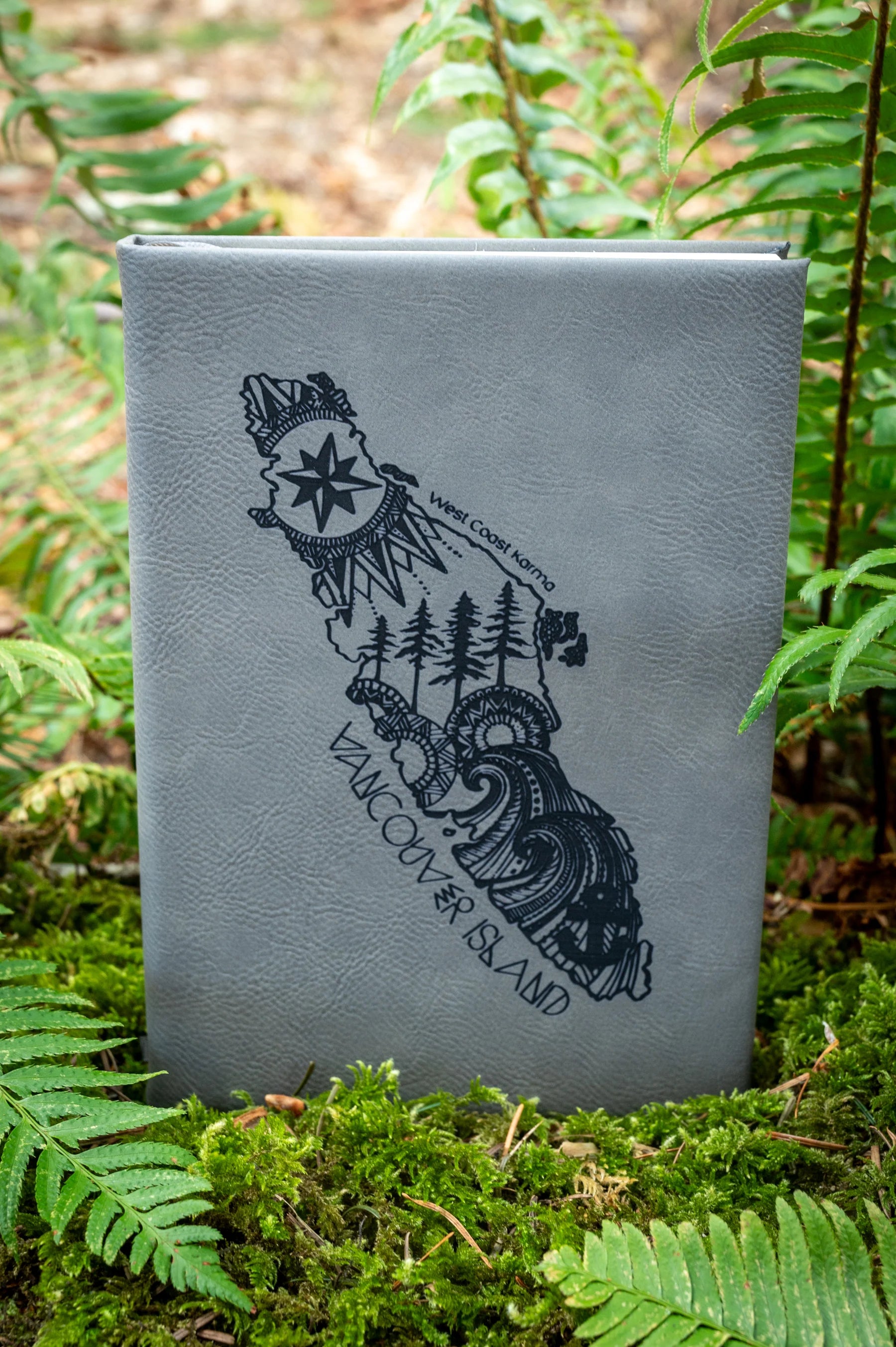 The Vancouver Island journal is perfect for writers, travelers or those who love to journal. Locally engraved with a laser which won't fade or scratch away. It has the look and feel of genuine leather but this synthetic material resists water spots, cleans easily and is durable enough for daily use. Lined pages and a satin ribbon bookmark.
